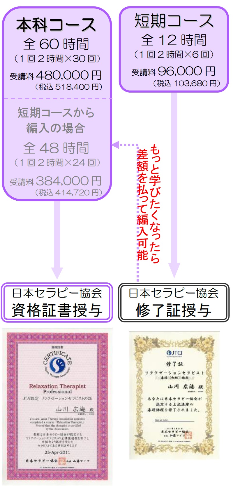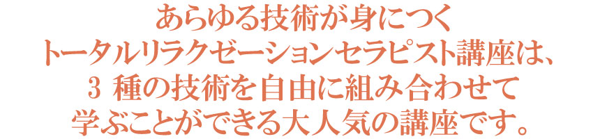 『リンパドレナージュ+バリニーズオイルマッサージ+リフレクソロジー』=【オイルマスター】 『ボディケア+リフレクソロジー+マイア色彩心理学』=【ココロとカラダのスペシャリスト】など、なりたいカタチのセラピストを目指すことが可能です。